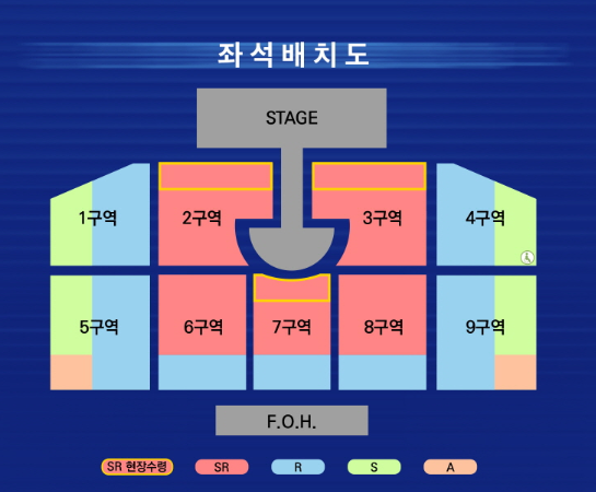 A. SR석은 무대와 가장 가까운 프리미엄존이며, 현장수령만 가능합니다. R석은 그 바로 뒤 구역입니다.